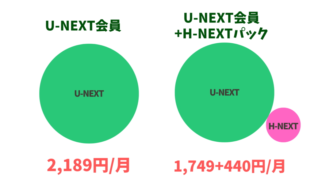 H-NEXTは動画配信サービス”U-NEXT”の中にある成人向けの動画配信サービスの名称です。現在H-NEXTは追加のパック(440円)という扱いになっていますが、追加した場合、U-NEXT会員月額が440円分割引になるので、H-NEXTパックは実質無料で追加できます。